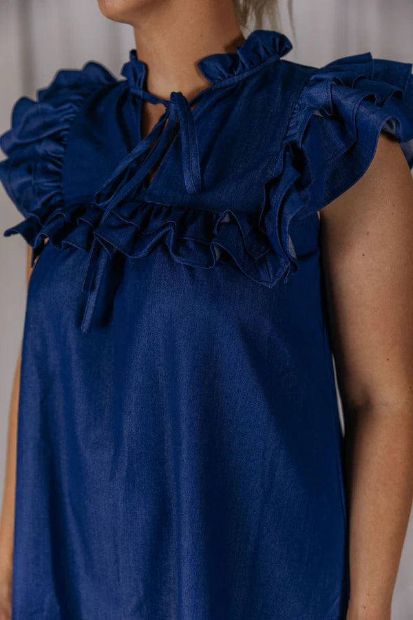 This denim dress features a V-neckline with ties, flutter ruffle sleeves, and square ruffled detailing on the chest and back. 70% Polyester & 30% Rayon.