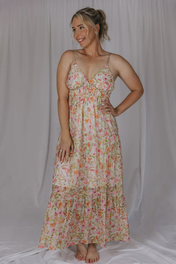 This tiered long length dress features a V-neckline, bow tie back, adjustable straps, and elasticized detailing on the bust/ waist. 80% Tencel, 20% Nylon body & 100% Polyester lining.