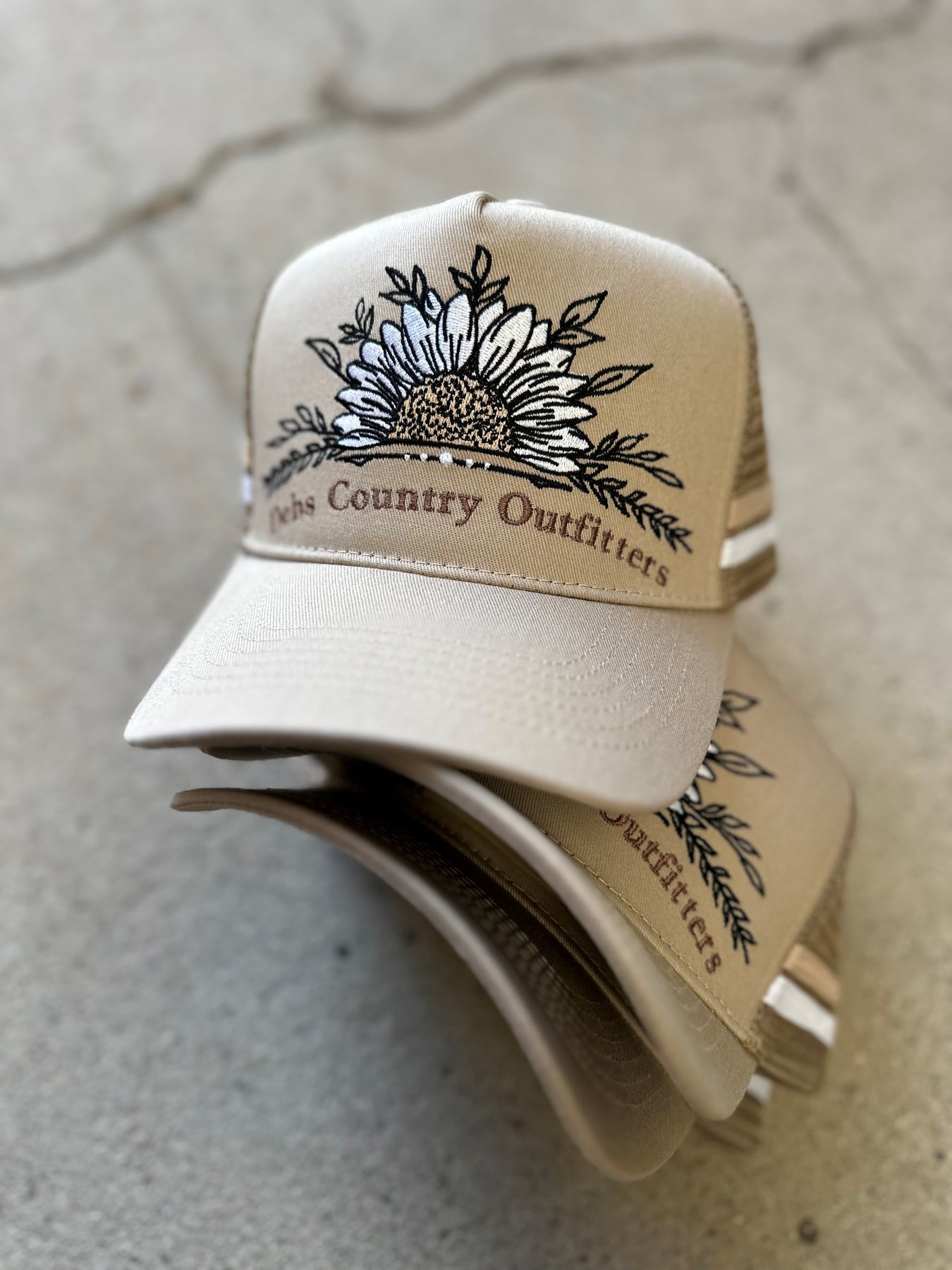 Beige with Darker Mesh and a Stitched Debs Sunflower Logo.